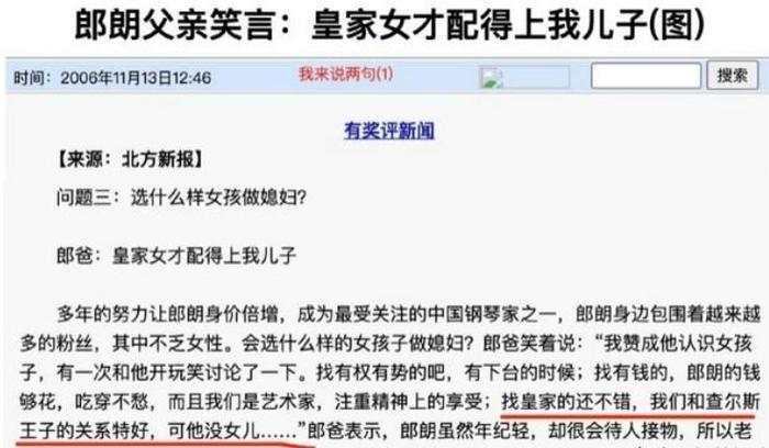 其一是早有消息传出郎朗的父亲对于自己未来儿媳的要求极高。曾经有记者在采访中问到这个问题,郎朗父亲的回答是找皇家的还不错,我们和查尔斯王子的关系特好,可是他没女儿。这也可以体现出他对儿媳的要求极高。巩新亮虽然是当时风头正盛的演员,但是她的背景却差了很多,更不用说后来她被曝出一系列的丑闻,更让她的名声跌至谷底。郎朗父亲的要求那么高,自然不会接受这样的儿媳。