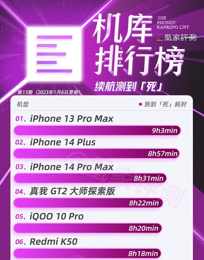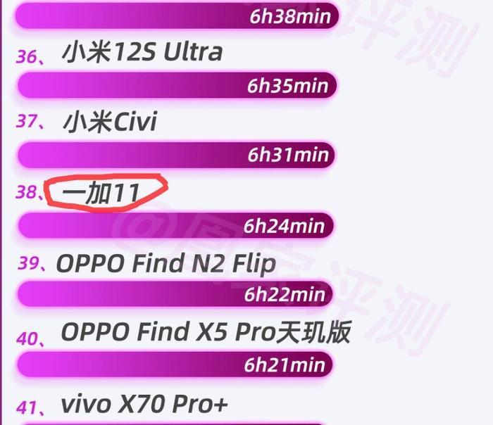 在另一家知名评测机构@凰家评测的续航排行榜中,一共55款机型参与评测,最终一加11排名第38,续航成绩6小时24分钟,与冠军iPhone 13 Pro Max的9小时3分钟足足差了一部电影的时长。