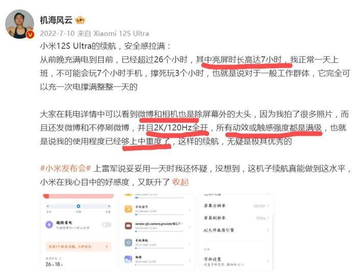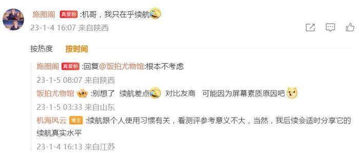 有趣的是,我们查找其微博,恰恰找到了他对另一款安卓旗舰续航的使用体验评价,在他看来,亮屏时长撑满7小时,对上班族而言,才算能放心用一天,也就是说,如果亮屏时长仅4个半小时,哪怕是上班一族,可能都需要一天两充。