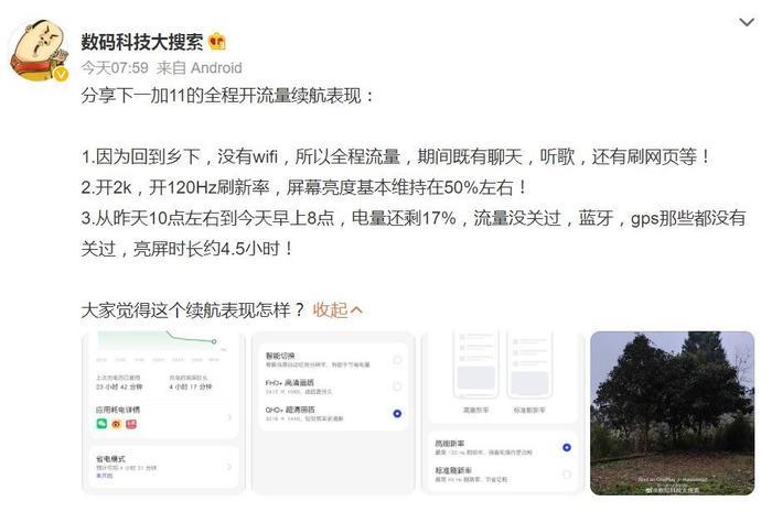 黄V博主@数码科技大探索也分享了他的一加11全程使用流量(不连WIFI)的续航表现,屏幕亮度在50%左右,亮屏时长撑了4.5小时,按照这一成绩,过年想在老家开心玩一加11的话,可能至少得2充以上了。