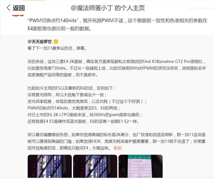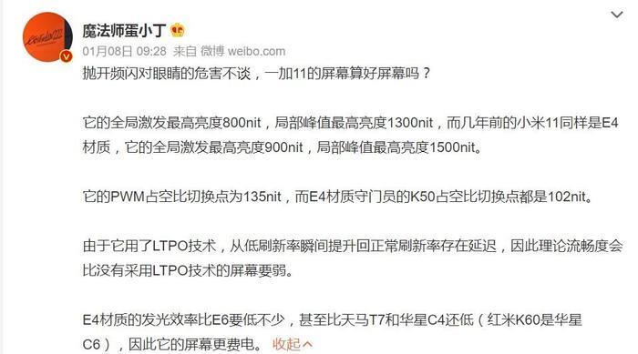 其中有精通OLED屏幕调光技术的专业博主@魔法师蛋小丁 指出,这块屏幕最大的槽点在于低频PWM调光对视力的损害(不护眼),以及面板一致性和色准相关的参数在E4面板里也比较一般,这与一加发布会上吹得“屏幕天花板”形成了较大的落差。