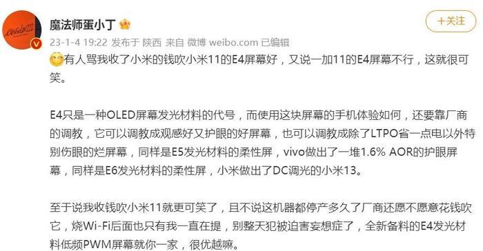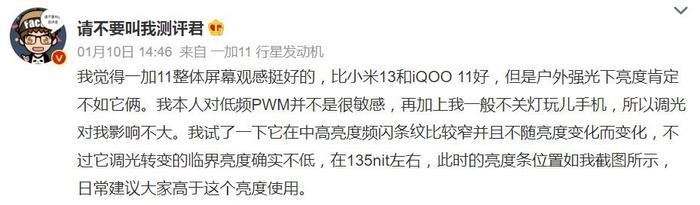 当然,也有博主认为一加11的屏幕观感要好过小米13和iQOO 11,后两者为一加11同价档的有力竞争对手,不过@请不要叫我测评君也指出,他个人对低频PWM并不敏感,户外强光下一加11屏幕表现不如小米13和iQOO 11。