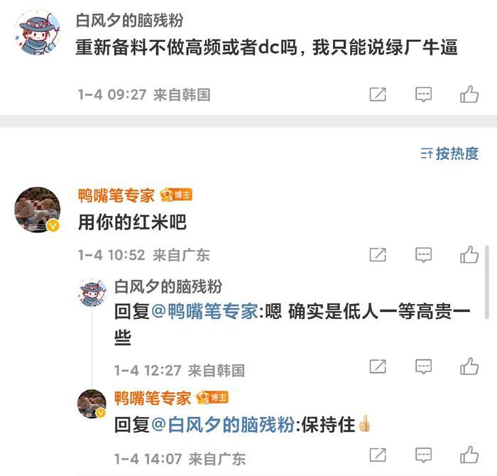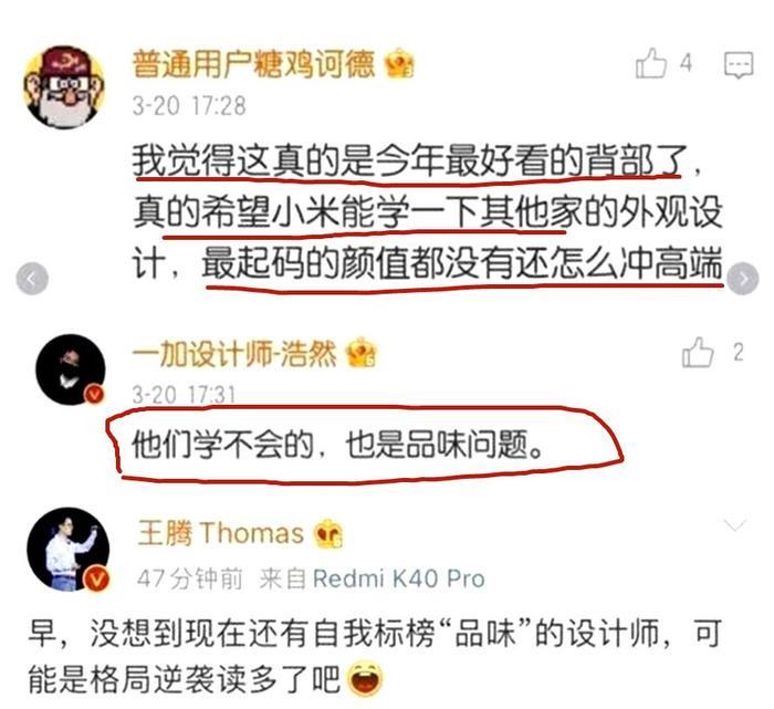 而实际上,一加官方人员跟小米(红米)用户起beef,还得从上一代产品一加10 Pro说起,彼时有网友留言说“真的希望小米能学一下其他家的外观设计,最起码的颜值都没有还怎么冲高端”,然后心直口快的一加ID设计师刘浩然回复到“他们学不会的,也是品味问题”话音一落,整个机圈都沸腾了,小米中层管理者王腾都亲下场回怼,更有无数大V和网友加入开撕。
