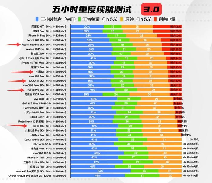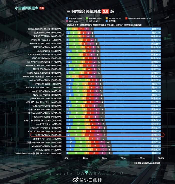 在知名测评大V@小白测评的《 5小时重度续航测评排行榜》中,5000毫安时电池的一加11仅排名第23,这一水平,明显不如近期发布的8Gen 2新机比如Redmi K60 Pro、小米13系列和iQOO 11等。