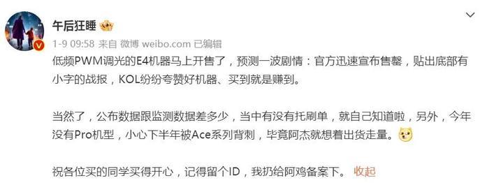那为何投放的KOL和官方人员急着下场辟谣呢?理由是,网络上已经有不少人吐槽这块E4屏了,而且在新机发布后的一周,首销后的3天,很多人拿到真机之后,吐槽反而愈演愈烈,这种现象,在科技数码圈确实比较罕见。
