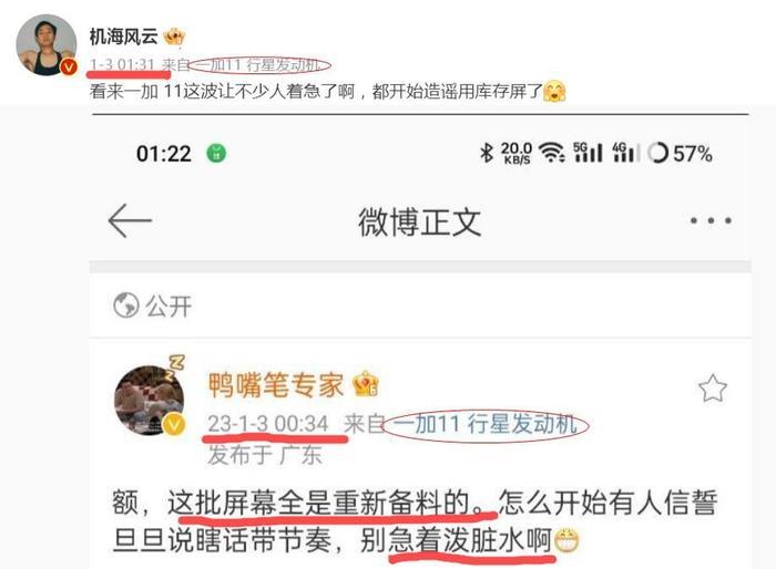 2023年1月3日,一加11正式发布前一晚,已经使用上一加11新机的KOL@机海风云 在凌晨1点30,还在积极地为“一加11使用前代10 Pro的库存屏”而辟谣,援引的信源是一加产品经理@鸭嘴笔专家的微博。