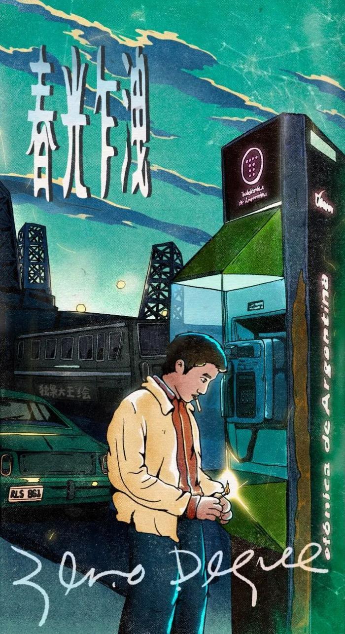 独枭大王创作的海报是《春光乍泄》,场景选取了黎耀辉离开布宜诺斯艾利斯前在电话亭徘徊的场景,梦醒后各自散去,夜色弥散。