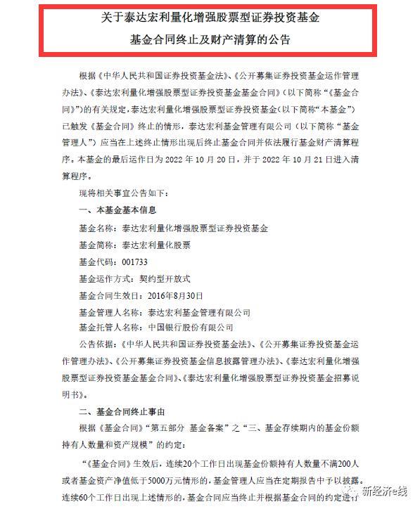 据新经济e线了解,继今年3月10日泰达宏利业绩驱动(A/C)到期清算之后,泰达宏利量化增强也于10月21日公告即日起正式清盘,基金最后一个运作日为2022年10月20日。