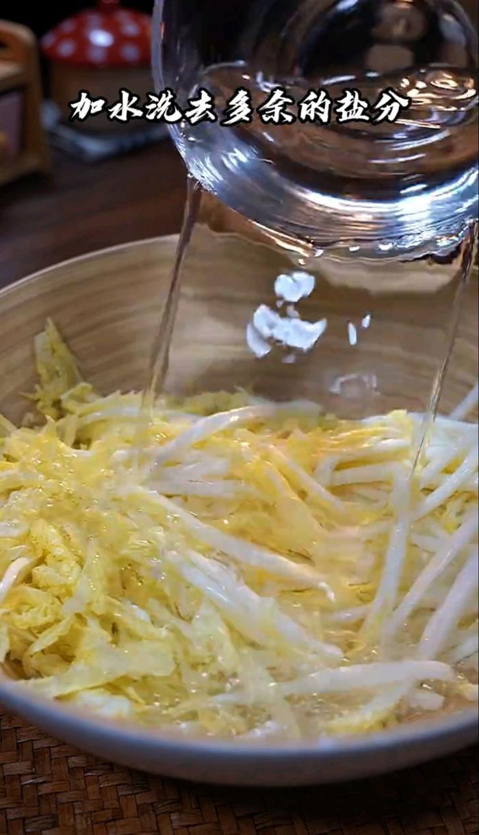 步骤3、随后向白菜中撒入些许的食盐,腌制一会,这样能够将其中的水分腌出来一些,吃起来更脆嫩。