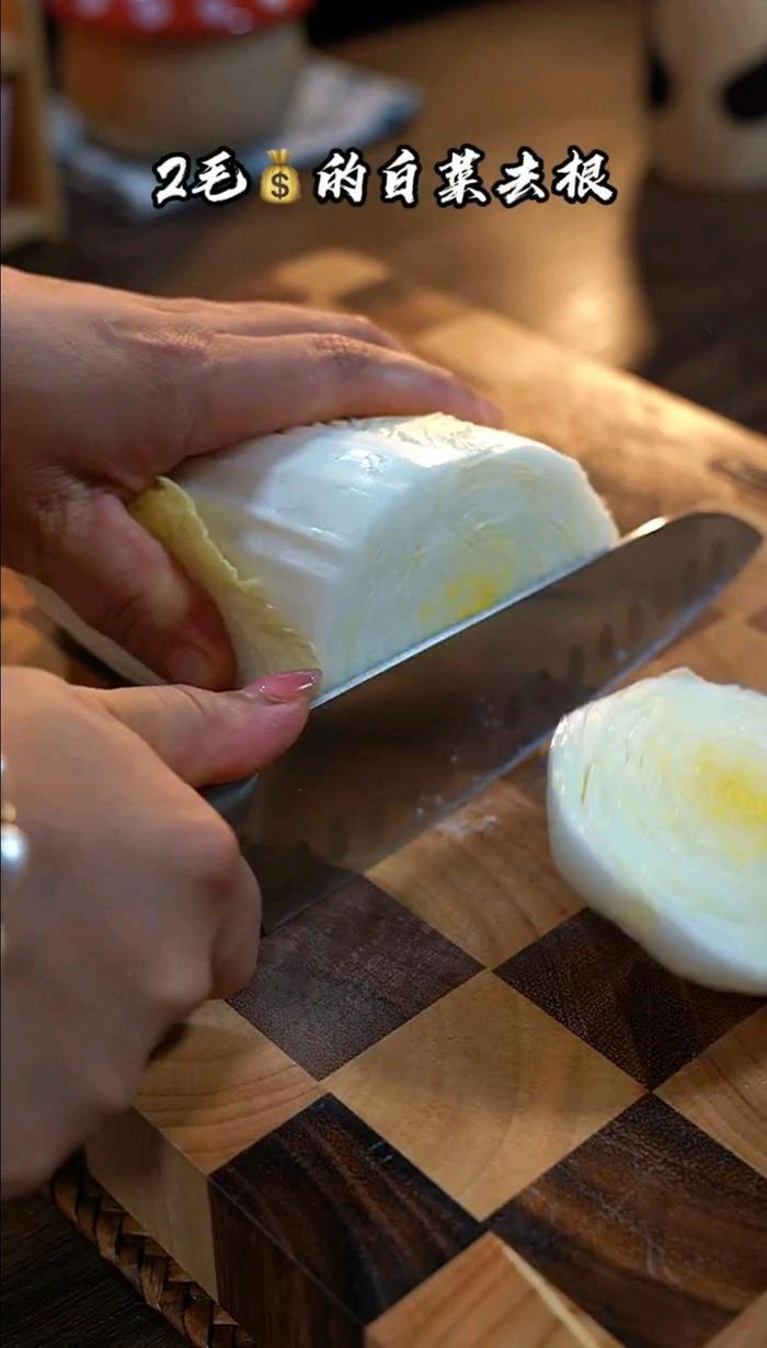 步骤1、首先我们来准备一下主要的食材白菜,将白菜用刀先剁掉根部,这样就可以将叶子全部分开,然后分别用清水洗净后再重新叠在一起备用。
