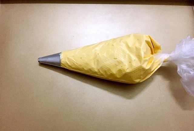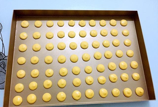 6、用裱花袋挤在烤盘上,形状按照自己的喜好即可。烤盘上可以刷上一层食用油,这样可以防止蛋黄饼干粘连,这个时候要提前将烤箱预热一下,200度的烤温预热10分钟,然后等待一会儿即可。