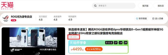 以腾讯ROG游戏手机6为例,上市7个多月,其在京东平台仅斩获1万多个评价。而在天猫平台,我发现ROG玩家国度官方旗舰店竟然不销售腾讯ROG游戏手机6,该机只在天猫第三方店铺销售,其中ROG鸿为源专卖店销量排名靠前,但月销量只有少得可怜的200多台,这无疑是个拿不出手的糟糕成绩。