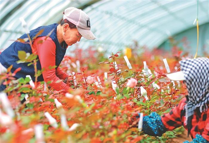 寒地花卉基地不仅强了村,也富了百姓。王丽艳是北甸村村民,自从村里建起花卉“数字工厂”,她就来到这里上班,鲜花剪枝装袋样样在行。“离家近,每个月还有三四千元工资。”王丽艳说这话时满是笑意。如今,像她这样在花卉基地就近就业的农户平时有20人,忙的时候需要30多人。