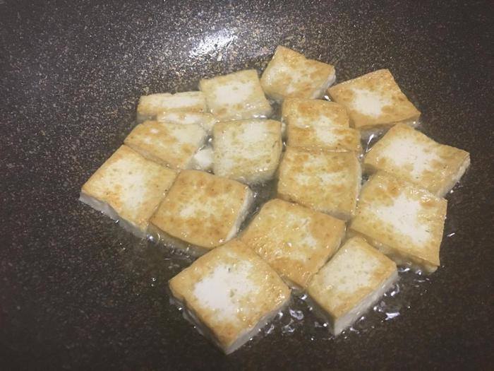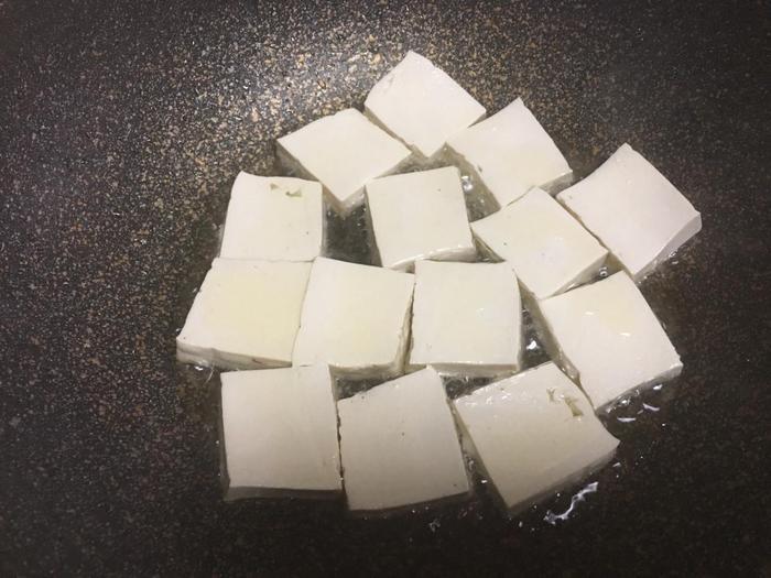 7、锅中加入少许食用油烧热,将切好的豆腐放进锅中煎至金黄定型。煎豆腐时不要着急翻动,以防将豆腐翻碎了。