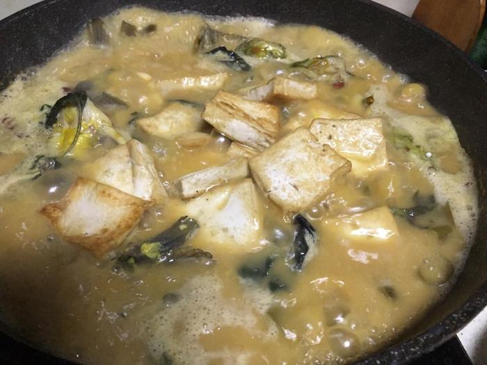 12、继续加入生抽、料酒、蚝油、食盐调味,然后把煎好的豆腐也倒进锅中,慢炖入味,出锅前加点葱花小米辣就能开动啦。