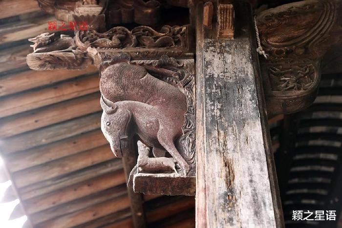梅花鹿群雕刻中,最令人称奇的是正堂左右立柱上的梅花鹿,一公一母,左右对称,母鹿身旁还有小鹿,栩栩如生,颖之沉浸于古人的艺术魅力之中,流连不忍离去。