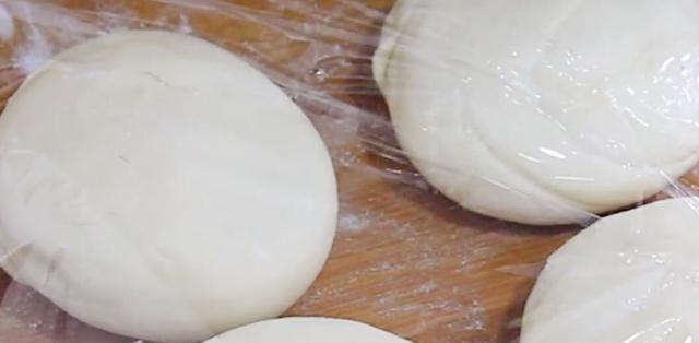 3.松弛好的面团取出来,先揉成一个长条,再用刀切成大小均等的剂子。取一个剂子,先揉圆,再压扁,然后用擀面杖擀成一个大圆饼。好,最关键的一步来了,在面皮表面均匀的抹上一层油酥,油酥能够让揉在一起的面饼不粘连,所以这是让鸡蛋灌饼鼓起大泡的小诀窍。然后把涂好油酥的面饼可以像叠被子一样叠起来把口捏好,也可以像包包子一样把口收紧,总之口一定要收紧,然后揉成团,再压扁,收口处一定注意不要弄上油酥,不然捏合不了要漏气哦。盖上保鲜膜,继续松弛10分钟,这样松弛后的面团没有那么筋道,更易擀成一个薄面饼。