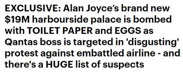 其首席执行官Alan Joyce价值1900万澳元(RMB9500万元)的海滨豪宅上被扔鸡蛋和卫生纸。