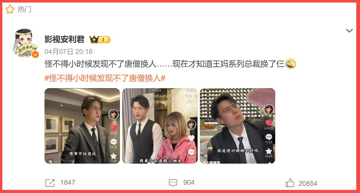 现在才知道,近期网红七颗猩猩的【王妈系列】短视频中,霸道总裁竟然已经换了三个人!