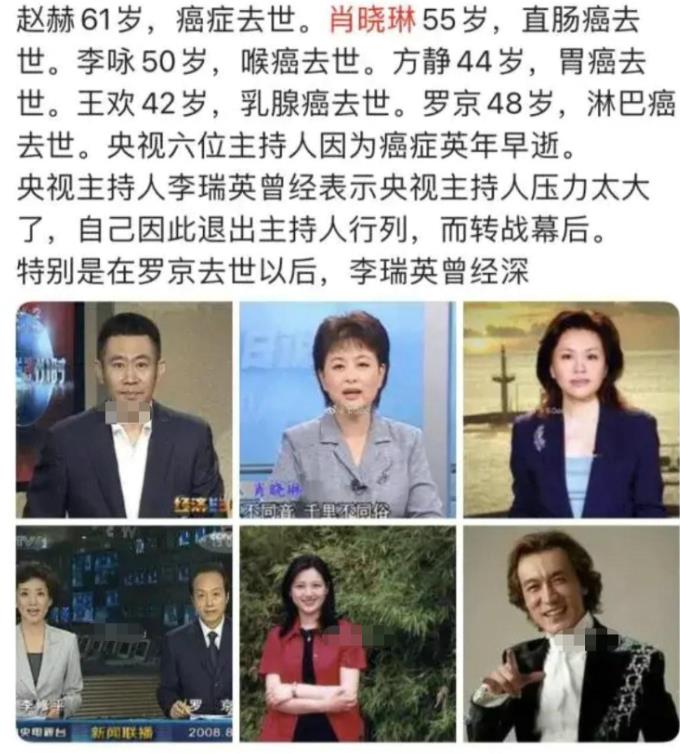 其实在央视还有很多主持人,他们都因疾病离世,肖晓琳55岁时因直肠癌离世,李咏50岁因喉癌离世,罗京48岁因淋巴癌离世。