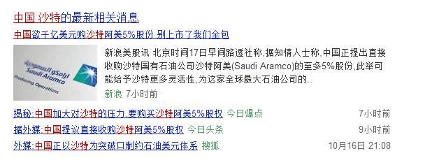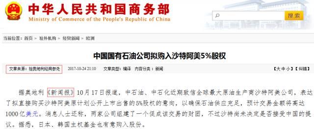 上个月初,老萨勒曼出访俄罗斯,对外界释放出“亲俄弃美”的信号。利雅得这种讯号让中国意识到一个关键:突破沙特的时机或已到来。当月,中国就在石油合作方面向沙特递出橄榄枝:10月24号,中国商务部官方网站以外媒报道的形式向外界放出“中方有意控股阿美”的消息。