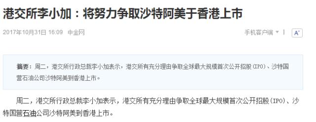10月31日,港交所总裁李小加表示:将尽最大努力争取沙特阿美在香港上市。
