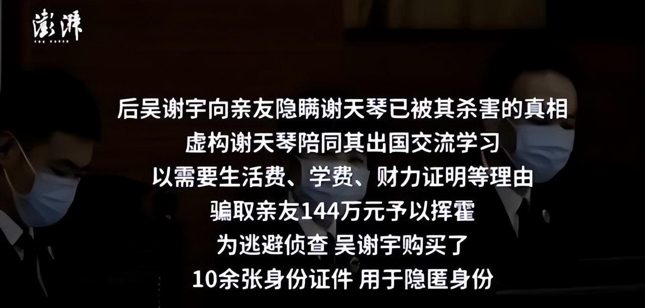 处理好杀人现场后,吴谢宇骗取亲朋好友钱财144万,网购十多张身份证,畏罪潜逃。