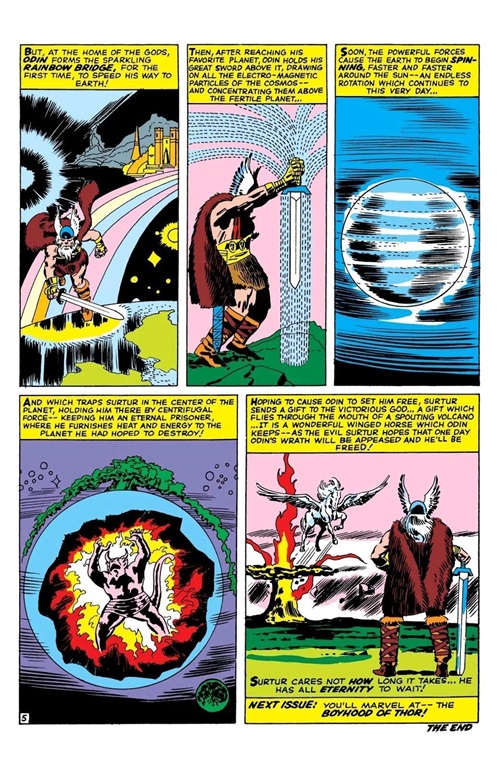 奥丁利用他的剑吸引宇宙中的所有电磁粒子,并将它们集中在星球上方,这股强大的力量促使地球无尽地运转,进而将苏尔特尔囚困在地心。