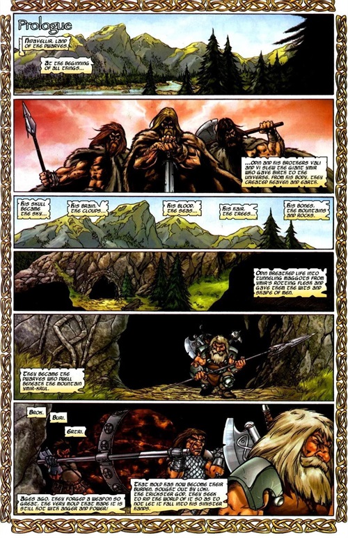 万物之初,奥丁与威利、菲杀死了冰霜巨人伊米尔 ,从他的身体诞生出了宇宙。奥丁将生命吹进伊米尔尸体上的蛆,因此创造出矮人。