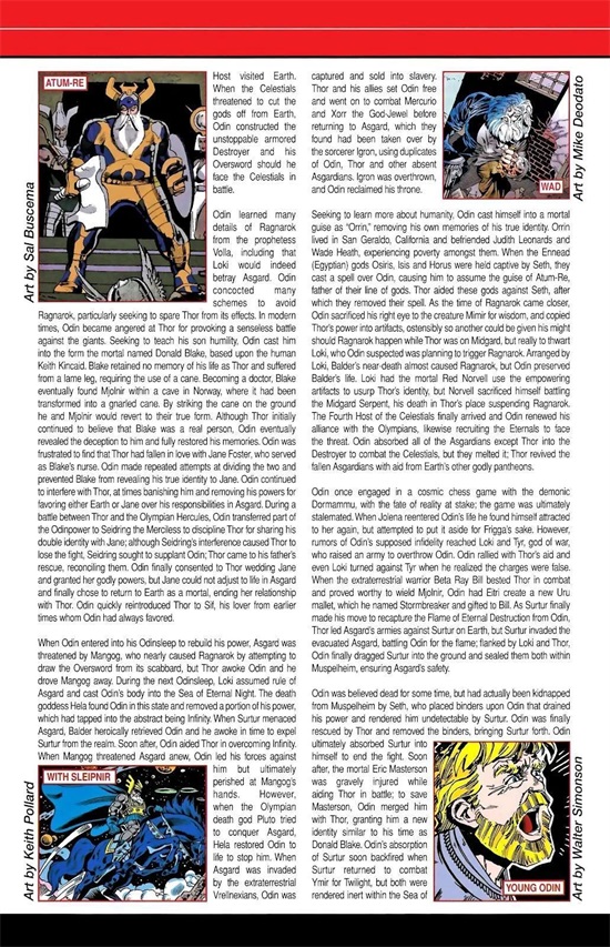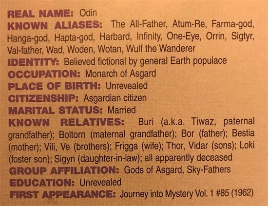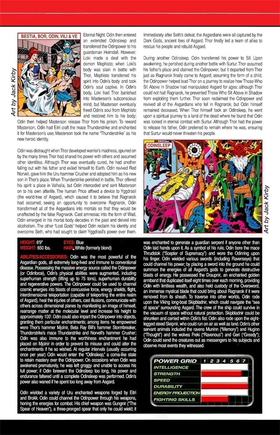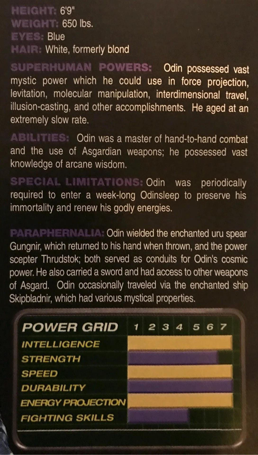 北欧诸神的众神之父和阿斯加德的统治者。 奥丁是最强大的阿斯加德神祇之一,很久以前,奥丁跟随他的兄弟威利和菲 对抗恶魔苏尔特尔 ,奥丁的兄弟牺牲了自身性命来避免苏尔特入侵阿斯加德,他们拥有的这股力量传授给了奥丁,因此创造出奥丁之力 。 藉由这股力量,他可以将巨大的神秘能量应用于各种用途,例如增强物理力量和耐久度、施加咒语于活人或对象、投射能量、悬浮、操纵分子、跨维度旅行、铸造幻觉、以及其他成就,奥丁之力也减缓了他老化的速率。 过去,奥丁统领着整支阿斯加德种族的生命能量,他亦需要周期性间隔的睡眠来恢复他的神力,称之为奥丁之眠。 奥丁挥舞着乌鲁铸造而成的长矛冈格尼尔 ,当投掷出去时会自动返回他的手中;以及称之为斯拉德斯托克的权杖,两者皆作为奥丁传导宇宙力量的管道,他也佩带了一把长剑,并且曾使用过阿斯加德的其他武器。