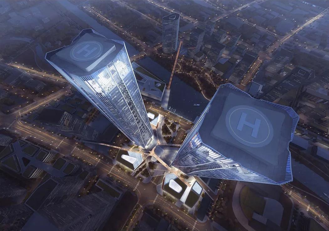 “科学之门”由两栋 320 米的塔楼组成,占地面积约 4.2 万平米,总建筑面积约 58 万平米,总投资约 142 亿元。设计独具匠心,打造出面向主干道的城市门户形象。塔楼的方位和结构经过推敲,结合基地价值及城市曝光面,与周边的裙房相组合,在大尺度的城市空间形态上围合出项目特有的半私密及私密空间。塔楼布局最大化地捕捉了基地面向城市主要道路的都市高层建筑景观。