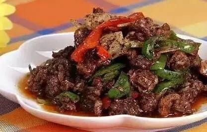 13.翻炒约五分钟后,开始进入关键的一步,浆血,一边倒入鸭血,一边要快速的翻炒,防止鸭血凝固成块,而不能均匀和浆在鸭肉上。