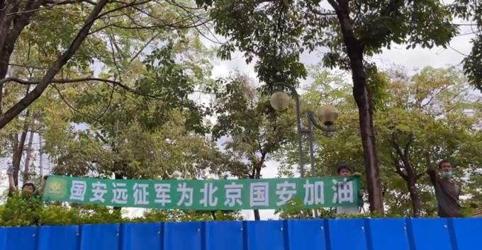 真球迷!2名国安球迷在球场外拉横幅助威,高喊:“国安是冠军”