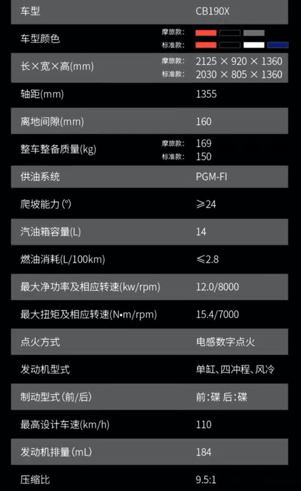 动力部分,新车搭载的是一台本田单缸风冷发动机,实际排量为184cc。其最大功率12kW,最大扭矩为15.4N·m。油箱容积为14L,最高车速为110km/h。