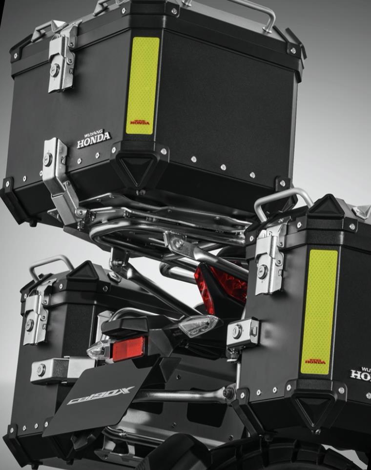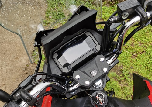 车尾造型很干练,标配了后载物架,尾灯主光源和转向灯为分体式布局。其中高配的摩旅版原厂提供了一个主后备箱和两个侧边箱。另外摩旅版还提供了护杠+护手+特供版花。