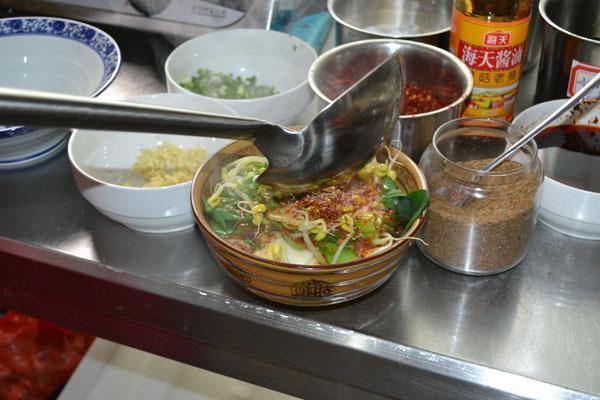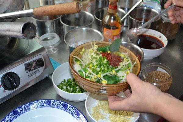 1、碗中依次放入煮熟的面、青菜、豆芽、蒜末、香葱、辣椒面少许;