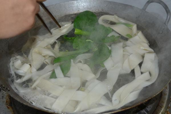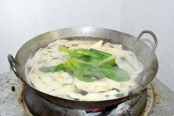 3、将扯好的面迅速下入沸水锅中,水再次煮沸后即可以把面捞出;