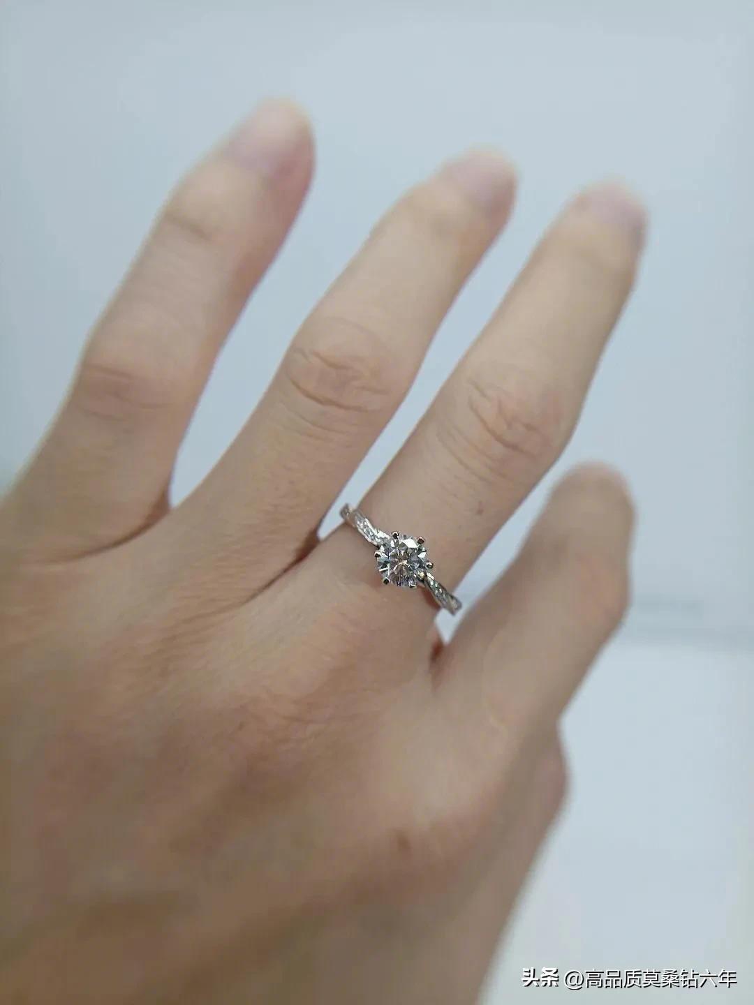 高品质的莫桑钻不是可以在某多某宝闭眼入的,仍然是可遇不可求的。高品质的莫桑钻颜色可以达到D色,白,透,闪,镶嵌好的成品钻戒,在社交距离内,绝对分不出来是莫桑钻还是钻石,绝对可以放心佩戴。