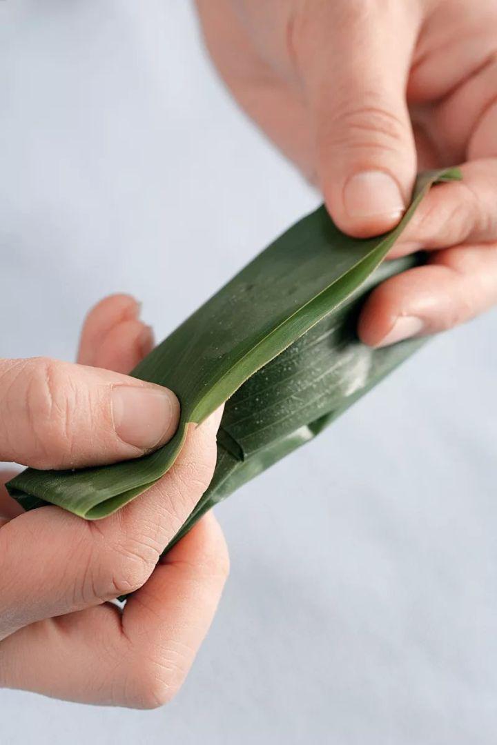 粽叶:南方产的这种粽叶用来包特别大的粽子,在使用之前直接从园中采摘下来,用热水稍微煮一下,就可以用来包裹粽子了。