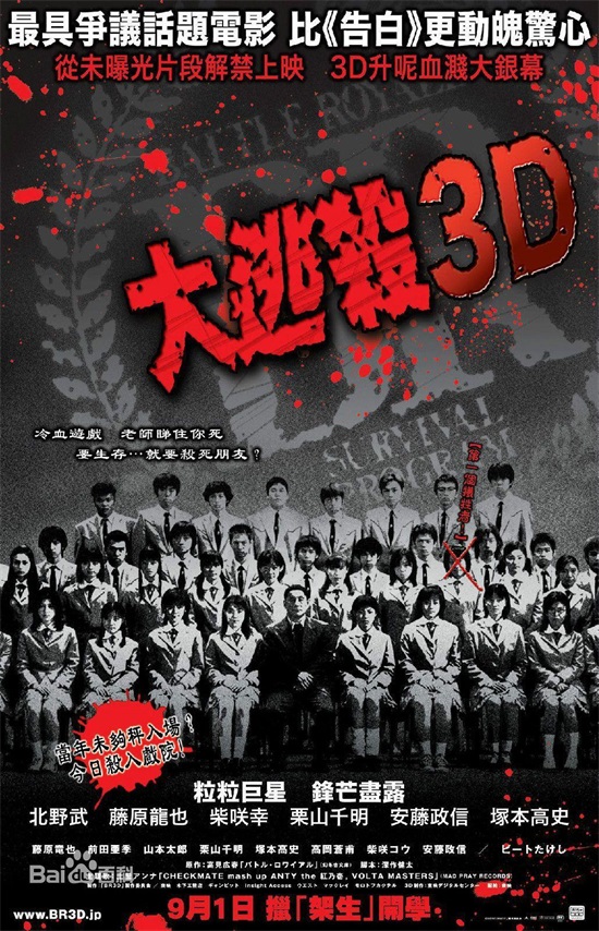 有人说《大逃杀》是人性的讽刺画,似乎所有的一切是由所谓人性的恶所造成的,这是完全不对的。如果《大逃杀》的主旨是揭露所谓人性的恶,那么电影的主角将完全是另一些人,而结局也将完全是另一个。《大逃杀》是这个社会的讽刺画,电影中的那个孤岛就是社会的极端的表现。电影中是颈环的逼迫,而现实中则生存压力的逼迫;电影中是互相残杀,而现实中则是残酷无情的竞争;电影中有人自杀,现实中迫于生存压力而自杀的人有不少少,电影中有桐山那样残酷无情的人,现实中也有人叫嚷什么“狼性生存”。