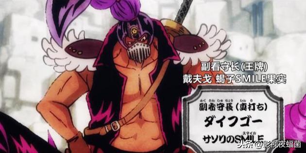 下面我们就聊一聊出场的两位真打,他们都是人造恶魔果实能力者,是凯多重要的战力。副看守长-戴夫戈,蝎子SMILE果实能力者。头顶有蝎子的尾巴,拥有六条腿,其实对于这种身体构造,夜蝠菌觉得他行动应该是很不方便的吧。