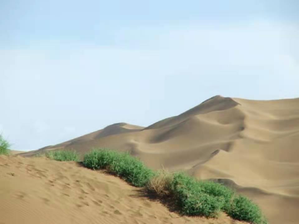 沙漠公园曾是一片连绵的沙丘,原名“狼墩子滩”,“朝为庄园夕为沙,不知何处是我家”,就是当时对这里恶劣生态环境的真实写照。后来,人们开园辟地,栽植树木,形成了两条强大的防风林带,固定了沙丘流动,成为一片绿色的海洋。