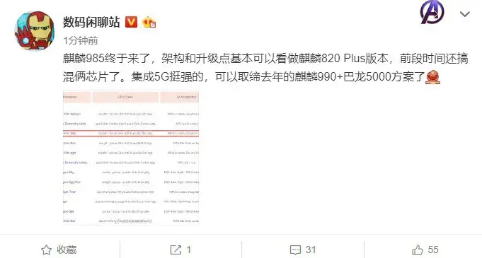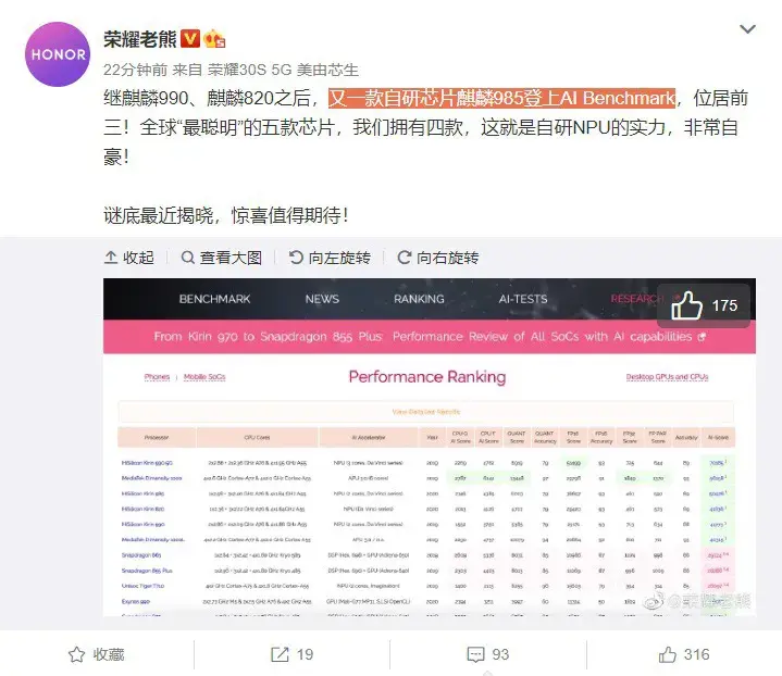 微博最新消息,最近,有关麒麟芯片的消息越来越多,而荣耀老熊在微博中确认了麒麟985芯片的存在,称麒麟985已经登上AI Benchmark,位居前三。