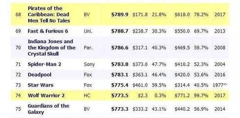 《战狼2》目前总票房的全球排名已经上升至第74位!恭喜吴京,恭喜《战狼2》!