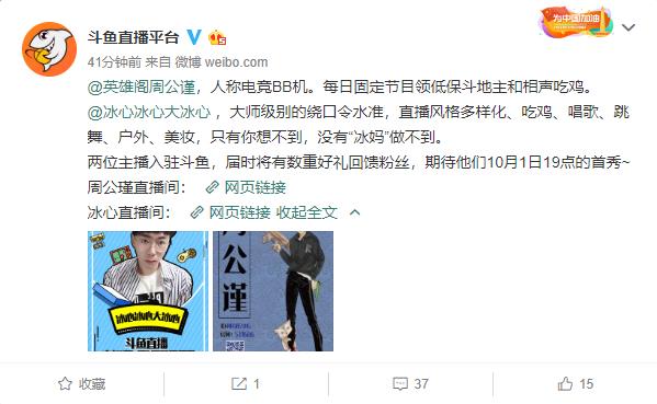 就在刚刚,斗鱼官方微博发了一则消息称冰心和周公瑾将会在10月1号晚上7点在斗鱼直播间与大家见面。刚看到这个消息的时候小编表示很震惊!消失这么久的两人什么时候签到了斗鱼呢?之前熊猫吃鸡百万主播错觉来到斗鱼的时候,斗鱼平台也没有发微博介绍,这次冰心和周公鸡来到斗鱼竟然还有微博欢迎,看来牌面不小啊~