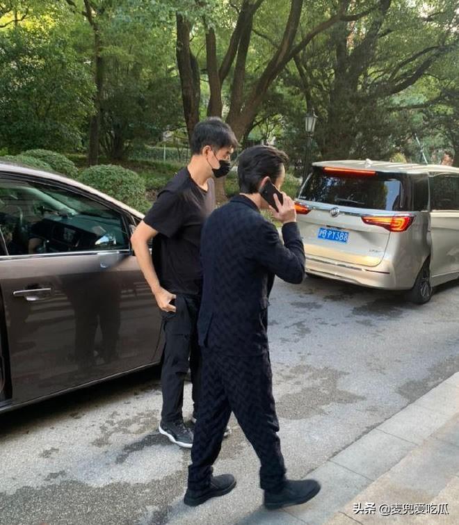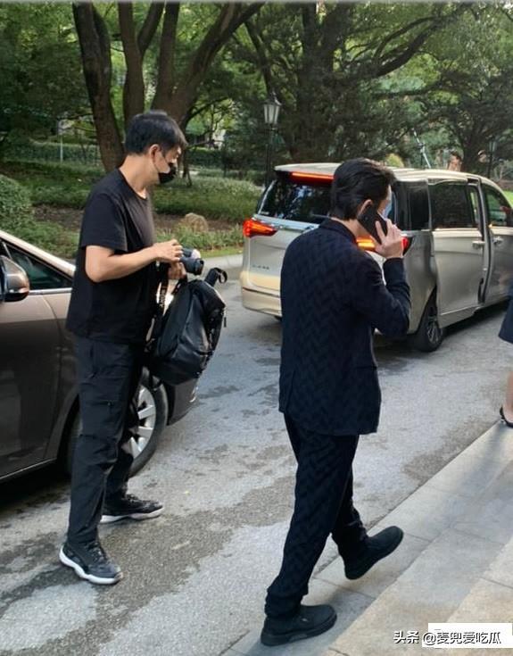 胡歌站在外面,一边走路一边打电话,助理帮忙拿着包,胡歌一副老干部的气势,西装革履,霸气十足。