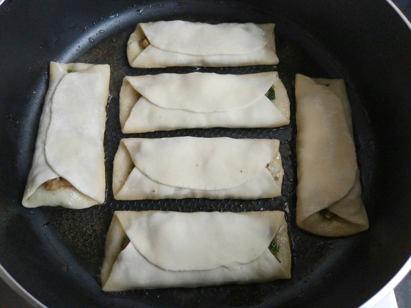 8. 平底锅倒入油,将包好的回头放入。