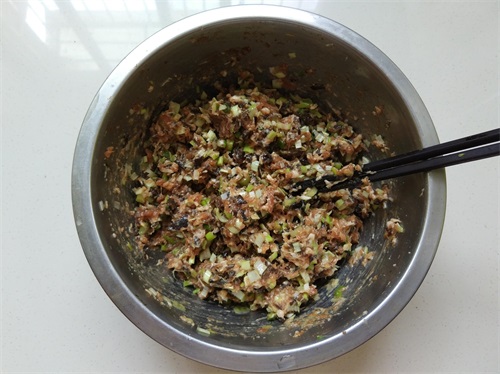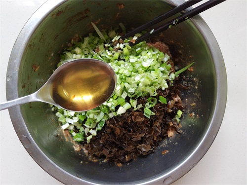 4. 大葱和木耳剁碎,包之前放入肉馅中,加入香油。