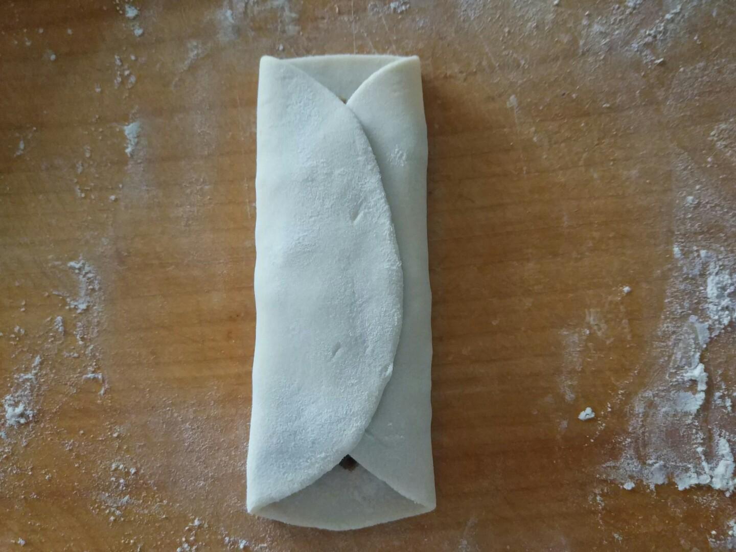 7. 擀成大片,包入馅料,两边向中间折就可以了,简单吧。