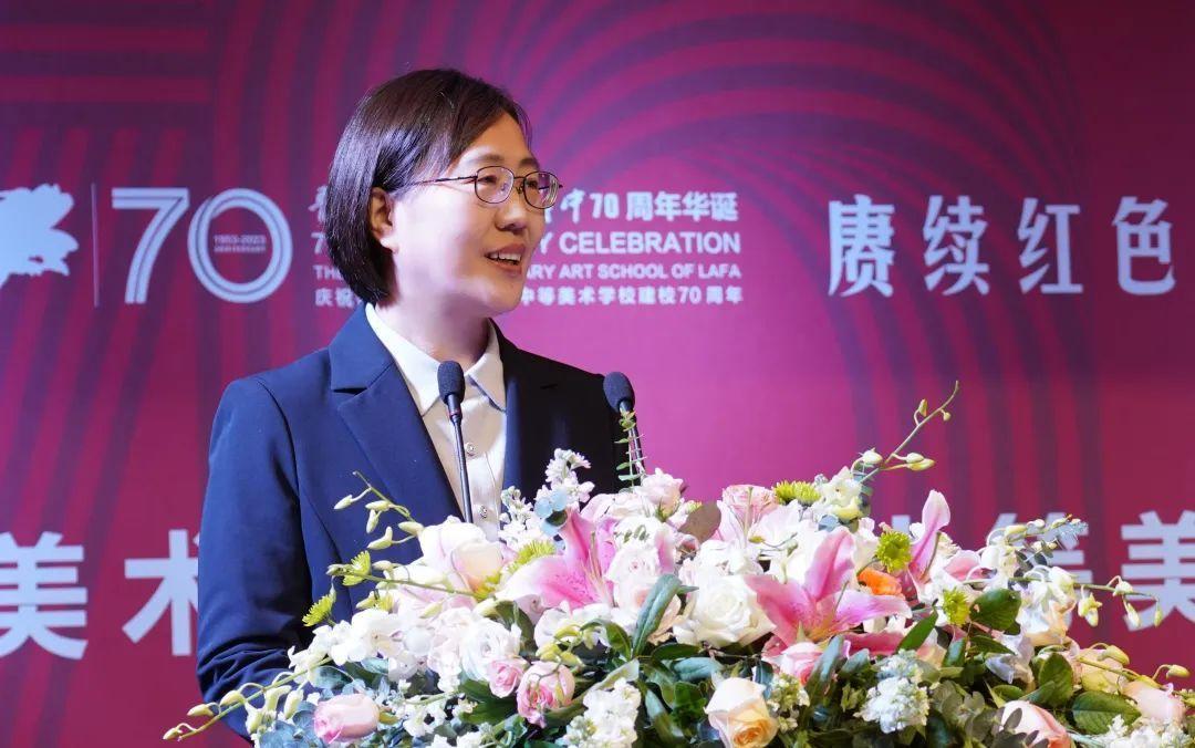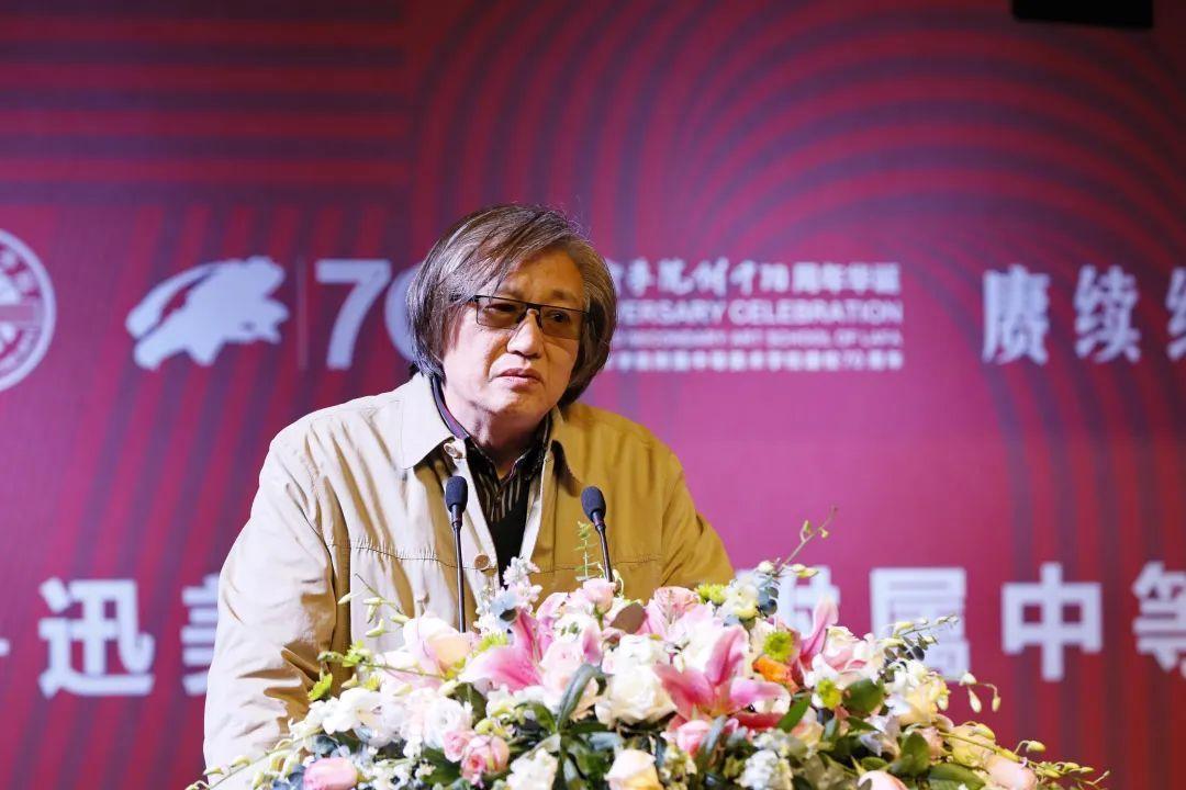 鲁迅美术学院党委书记苏萍在致辞中代表鲁迅美术学院对附中70周年暨复建25周年校庆活动致以最诚挚的祝愿。